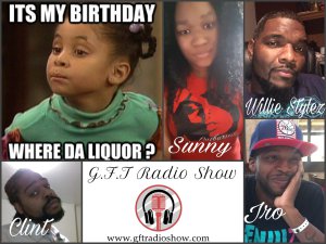 What’s your funniest drunk/high story? Since it’s Sunny’s birthday she wanted to do a fun show, we will share a few drunk stories. Why not laugh and listen to other people’s silly stories of nights when too much alcohol got the best of us, and impaired our judgment causing us to embarrass ourselves? Join in by calling in phone lines open up at 10:15pm (657) 383-1155. You can also tweet us live throughtout the show @gft_radio using the hashtag #GFTRadio
